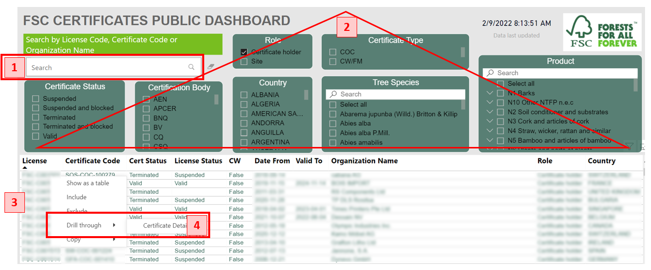 Certificate information is updated and available on our FSC Certificate Public Dashboard. The dashboard is provided via Microsoft’s Power BI Platform (see Microsoft’s Privacy statement) via the following link: FSC Certificate Public Dashboard